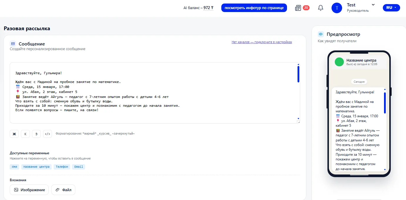 Пример сообщения: «Гульнара, добрый день! Хотела уточнить — удобно ли расписание: вторник и четверг в 17:00? Если не подходит, есть группа по субботам в 11:00. Подскажите, и я подберу удобный вариант.»