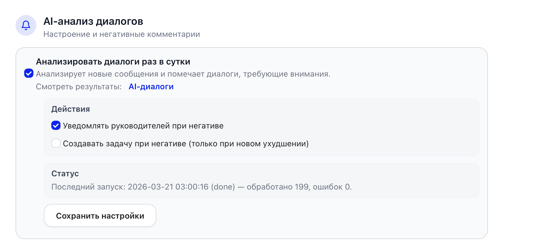 ИИ-анализ диалогов: подсвечивает проблемные переписки и настроение клиентов