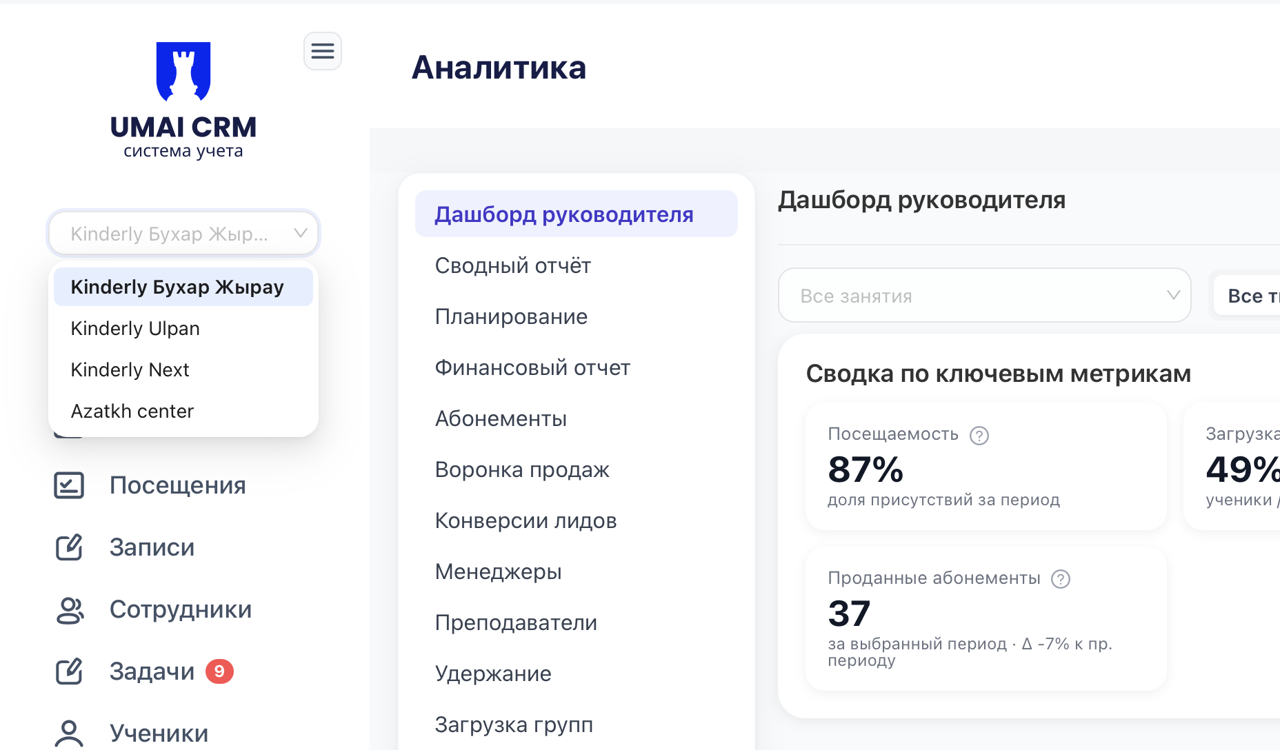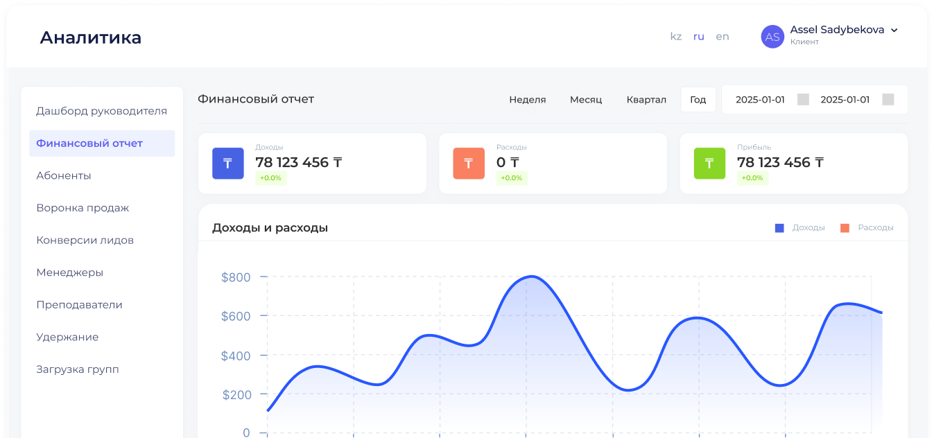 Отдельная аналитика по каждому филиалу: доходы и расходы, прибыль, конверсия, выручка преподавателей, загрузка аудиторий и динамика абонементов.