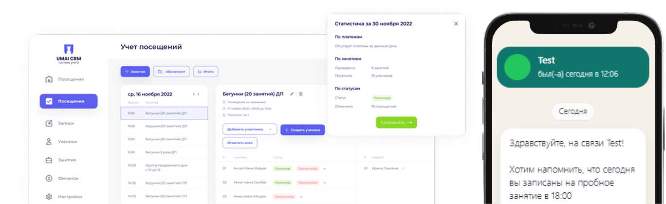 Открыть сравнениеUmai CRM создавалась практиками из сферы детского и дополнительного образования. Вместо связки из двух систем (например, Битрикс24/amoCRM для продаж и Alfa CRM/Paraplan/Hollyhope для учёта) вы получаете единую CRM: лиды и клиенты, коммуникации (WhatsApp/Instagram), ИИ‑чат‑бот, расписание и записи, посещаемость, расчёт зарплат и аналитика — всё в одном месте.