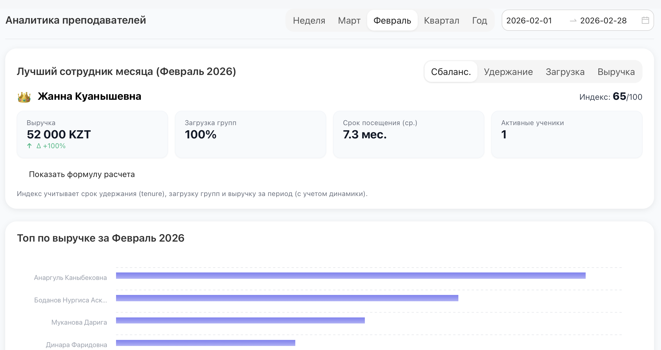 Показывает, как работает каждый преподаватель: заполненность групп, стабильность учеников, выручку и срок обучения. Вы видите, у кого группы растут, а где есть постоянные потери.