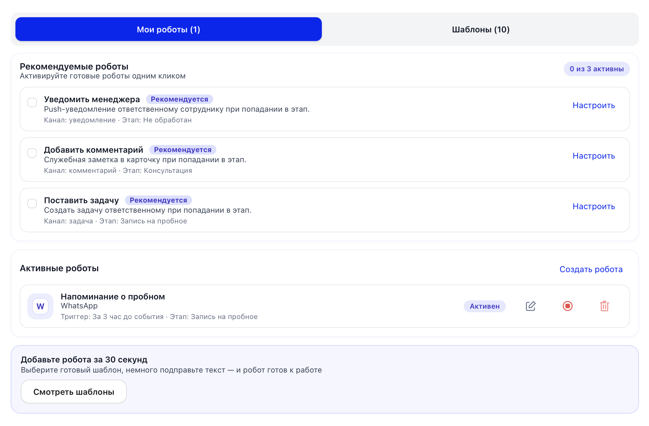Более 18 сценариев для быстрого старта - напоминайте о пробном, собирайте обратную связь, рассылайте дожимы, ставьте задачи сотрудникам, контролируйте NPS и многое другое.