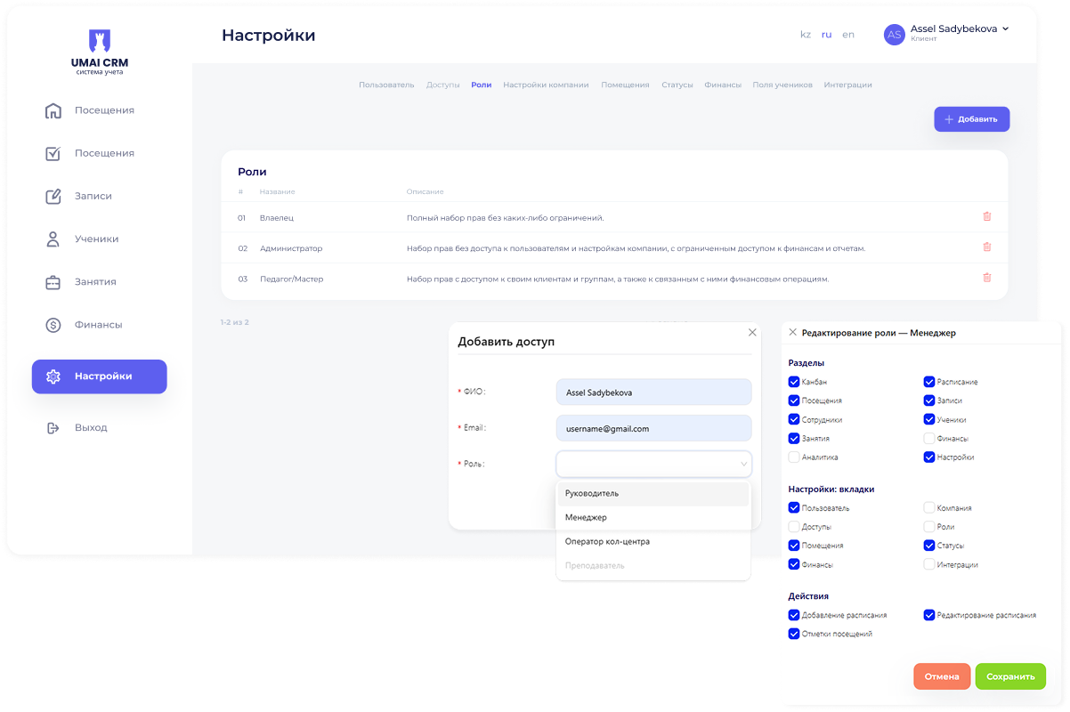 В разделе настройки - «Роли» создаются уровни доступа (руководитель, менеджер, преподаватель и др.), а в разделе «Доступы» добавляются сотрудники и назначаются соответствующие права. Каждый пользователь видит только те разделы и действия, которые ему разрешены.