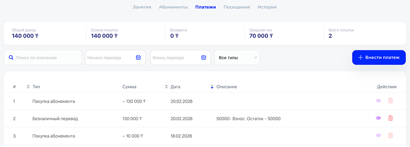 Вносите оплату ученика за абонемент или услуги в несколько кликов. Платёж сохраняется в истории, учитывается в финансах и автоматически списывается с баланса ученика.