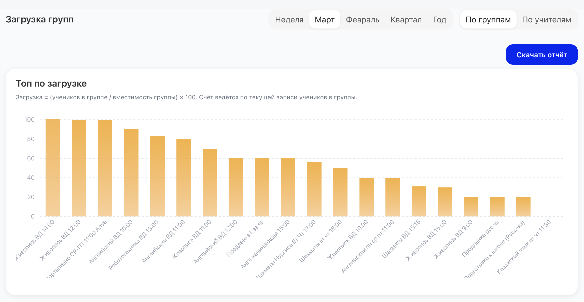 Видно, какие группы заполнены полностью, а где остаются свободные места. Легко понять, где добавить учеников или изменить расписание.